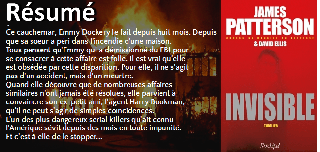 Invisible a été une excellente lecture, un coup de cœur attendu au vu de résumé, qui s’est vite confirmé à la lecture du livre, dans une histoire entraînante, crédible et flamboyante. Le brasier qui est en vous ne demande qu’à s’allumer.