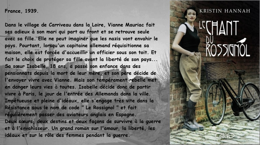 Le chant du Rossignol, c’est une lutte. Une lutte contre le pouvoir, contre l’ennemi, l’occupation, le nazisme. Mais aussi, dans notre monde, notre actualité, une lutte pour la place de la femme comme égal de l’homme. Une lutte incessante qu’elle se doit de faire pour faire valoir ses droits. Cette lutte est formidablement incarnée par Isabelle Mauriac, la jeune sœur de Vianne. Bon dieu que j’ai aimé ce personnage, son insouciance, ses convictions, ses pensées, ses rêves. Elle veut être le fer de lance de cette France résistante. De ces valeurs qu’elle défend tant. Elle veut tant et tout à la fois, si bien que la réalité rattrape souvent ses rêves, mais que ses rêves deviennent aussi sa réalité. Elle va vivre tant de choses, qui vont la faire passer à dix-huit ans du statut de jeune femme à adulte, immédiatement. Ça va être dur, très dur. Mais elle va surmonter les étapes une à une jusqu’à une irrémédiable finalité.
