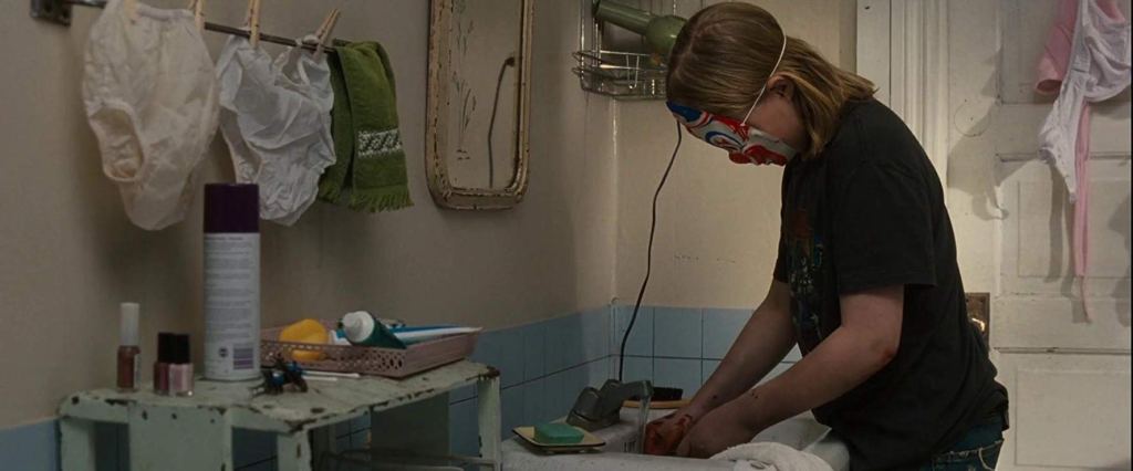 La question que l’on peut se poser, c’est si cette relecture de Rob Zombie tient la route. La réponse est oui et non (je suis normand). Oui, parce que le réalisateur s’offre le luxe d’amener un prequel et un remake. Non, parce que la deuxième partie du film perd en efficacité. Halloween de Rob Zombie démarre de la meilleure des façons, puisque celui-ci va s’intéresser à la jeunesse de Michael Myers, à son désordre psychologique, de son entourage destructeur, à son passage à l’acte et à son internement. Rob Zombie impose son style dès les premières minutes en apportant sa vision des choses et son ton. Vous pouvez oublier les cadres fixes de John Carpenter et cet aspect assez froid. Ici, Mr. Zombie s’adonne à son plaisir visuel et à son aspect sale favori. L’image est jaune, verdâtre par moment et celui-ci filme de façon explicite la jeunesse Michael Myers. Le réalisateur nous amène au plus près de cet enfant perturbé et cela instaure une autre sensation de malaise. Le choix de l’acteur n’est pas anodin, bien qu’il n’ait pas plu à tout le monde, car Daeg Faerch a une tronche qu’on oublie pas. Son regard nous perce et on sent la perte d’humanité l’envahir seconde après seconde. C’est dans cette première partie que l’on ressent le plus la touche Rob Zombie puisque celui-ci s’échine, de manière assez simpliste, à nous montrer sa vision de l’Amérique. L’univers du réalisateur est glauque, vulgaire et la famille en prend pour son grade…