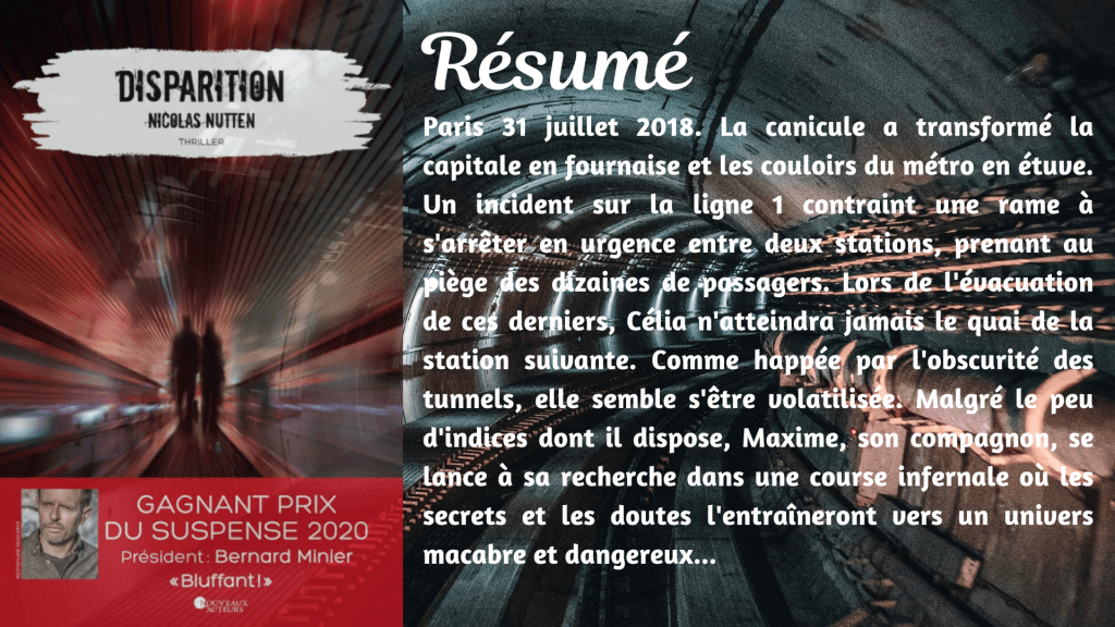 Ce thriller sans réel temps mort de Nicolas Nutten est vif. On se plonge avec le héros tête la première dans ses recherches. En effet, sa copine a disparu après un fort mouvement de foule dû à une explosion dans le métro. Dès lors, il va remuer ciel et terre pour éclaircir tout ça, effacer les parts d’ombres et semer la zizanie partout (presque) où il passe. Si j’ai préféré la première partie de l’histoire à la seconde, beaucoup plus portée vers une histoire de caïd étrangers qui, personnellement, me plaisent peu dans les thrillers. Ceci dit, la qualité globale d’écriture, d’images à la lecture et surtout de narration est à relever. Je vous présente ci-après plus en détail Disparition de Nicolas Nutten.