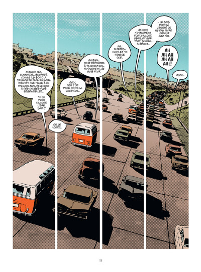 Sauf que sous ses airs un peu Pop art dans le trait de Charlie Adlard (qui est derrière les dessins de The Walking Dead), Altamont évoque la désillusion de la jeunesse face au désastre de la guerre du Vietnam et de la perte des idéaux que les hippies prônaient. Alors que le festival ne devait être qu’amour et partage, Herik Hanna nous offre de suivre la fin d’une époque.