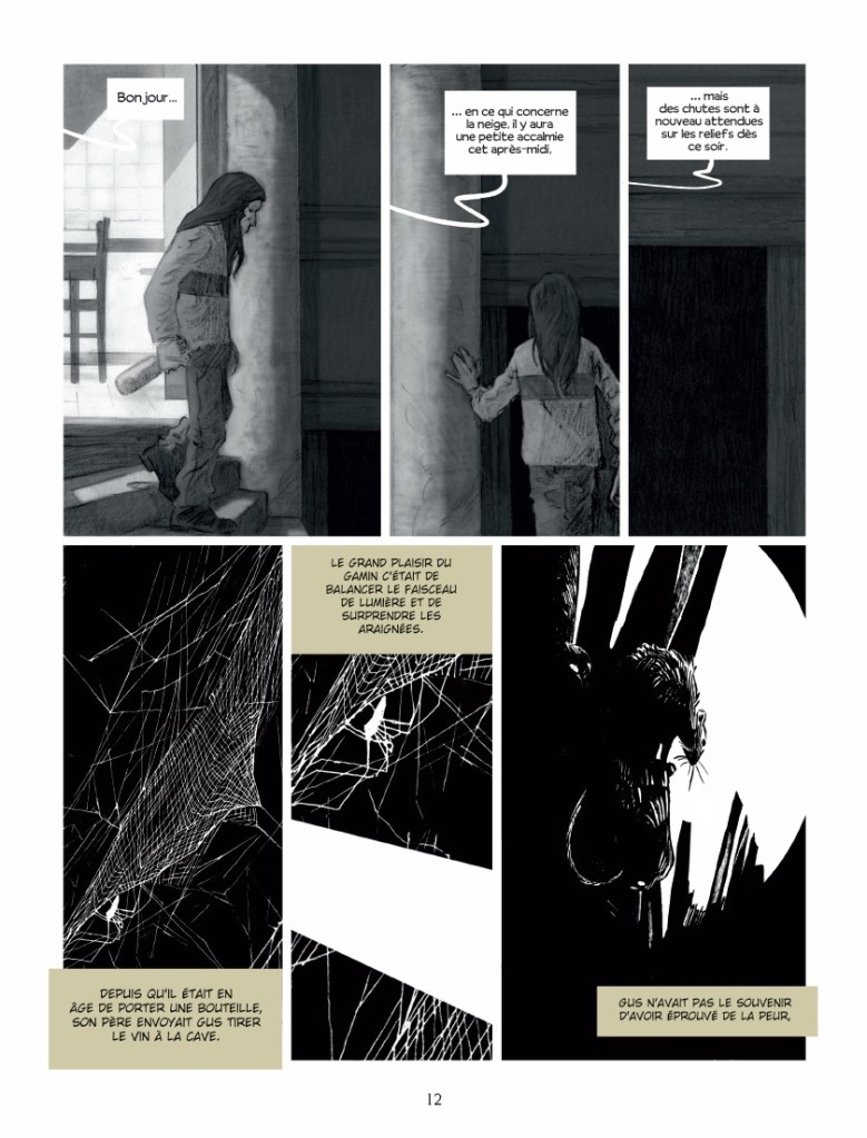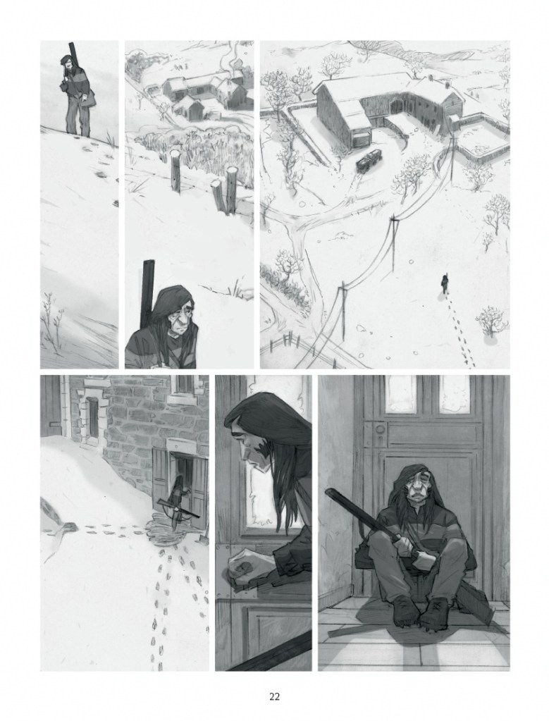 Bien sûr, le scénario de Grossir le ciel semble assez classique, mais Franck Bouysse le maîtrise à la perfection et nous plongeons avec délice dans cette histoire de trahison, de secret familial et de mort qui ne finit pas de nous travailler. Tout cela est retranscrit à l’aide de nombreux flash-back, permettant alors pour le lecteur de comprendre toute l’ampleur de ces thématiques qui travaillent nos personnages. Le temps neigeux est à la réflexion et ceux-ci ont le temps de ressasser le passé. Mais attention, tout cela pourrait avoir de lourdes conséquences. Le scénariste et auteur nous le fait bien comprendre avec un dernier acte d’une tragédie intense et bouleversante.