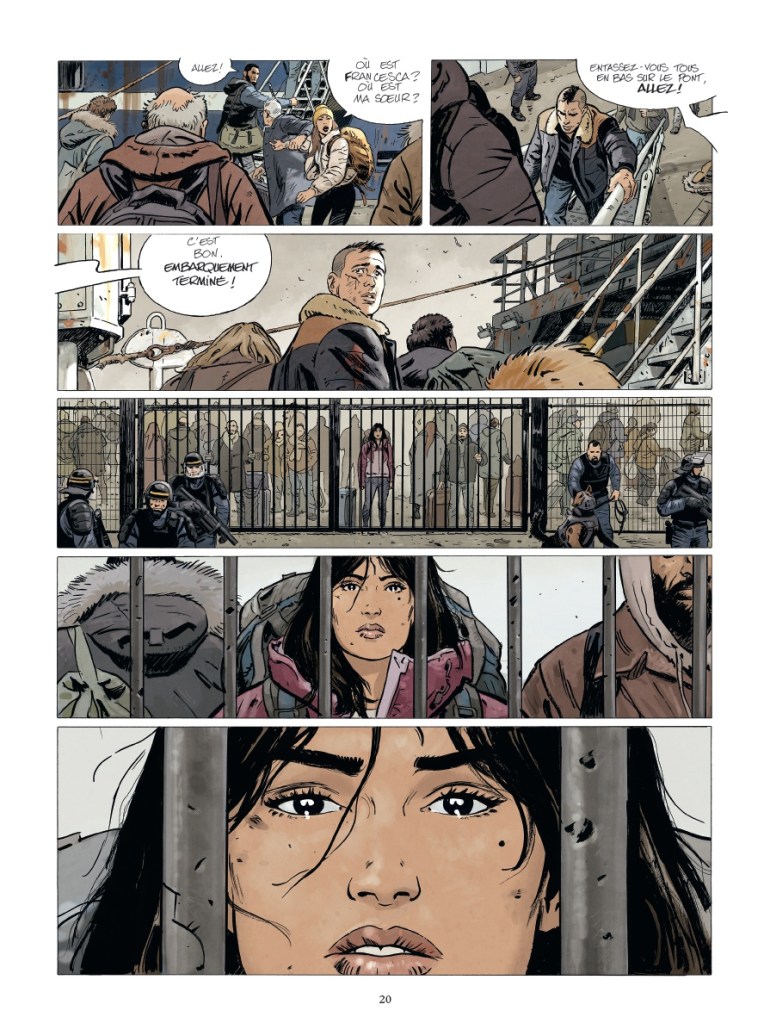 Le réchauffement climatique est sur toutes les lèvres depuis de nombreuses années. Nous sommes mis en garde depuis des décennies et pourtant rien ne semble se passer… C’est avec ce constat que Caryl Férey nous offre une bande dessinée d’anticipation, mais qui pourrait, par la force des choses, devenir réelle dans peu de temps. Ce premier tome d’Islander prend place dans une Europe fatiguée par la crise climatique et par toutes celles qui ont découlé de ces événements. Notre continent est en fin de course, instable et voit son territoire se transformer en zone d’attente pour des émigrés tentant de rejoindre certaines terres promises au nord du continent. Il suffit à Corentin Rouge de quelques pages pour nous présenter le port du Havre et pour nous faire comprendre toute l’ampleur du désastre qui se joue sous nos yeux. Les migrants ne viennent plus de l’Europe de l’est, du continent africain, du Moyen-Orient ou d’autres pays pauvres, mais bien des pays riches. Tout est remis en question, on se projette et on comprend alors toutes les problématiques qu’ils doivent endurer pour tenter de survivre…